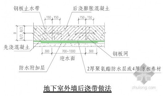 外墙后浇带外部须设防水附加层,防水附加层宽度需在两边各大出后浇带300mm以上。