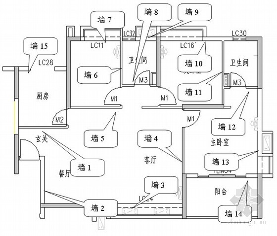 (1)实测区与合格率计算点:户内每一面砌体内墙作为1个实测区,累计实测实量20个实测区。所选2套房中实测区不满足10个时,需增加实测套房数。每1个实测区取5个实测点,分别检查合格标准中的6项内容是否符合要求。