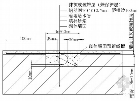(2)线槽尺寸:砌体墙槽深度dn+10mm,槽宽dn+60mm;空心砌块外墙水平沟槽长度小于390mm。