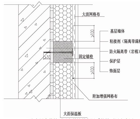 7、 当采用粘贴岩棉带防火隔离带时,防火隔离带应与基层墙体满粘并应使用锚栓辅助联结。锚栓位置在岩棉带中间高度,锚栓间距应不大于0.5m,锚栓距离保温板端部应不小于0.1m,扩压盘直径不应小于100mm,岩棉带长度应不小于0.4m。