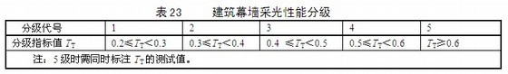 2、建筑幕墙采光性能分级指标透光折减系数T应符合表23的要求。
