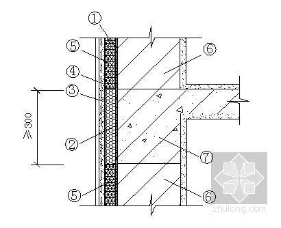 ①粘贴砂浆,②发泡陶瓷保温板,③抹面砂浆层(含增强网),④外饰面层,⑤保温系统保温材料,⑥基层墙体,⑦楼层梁