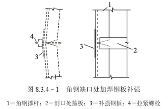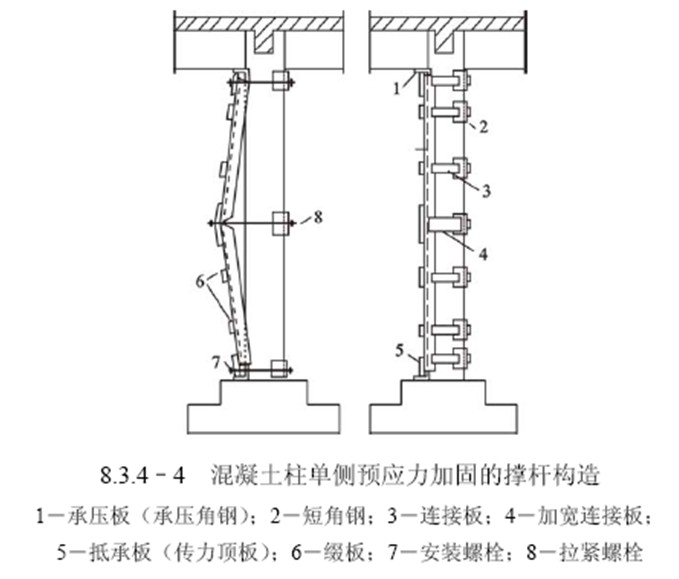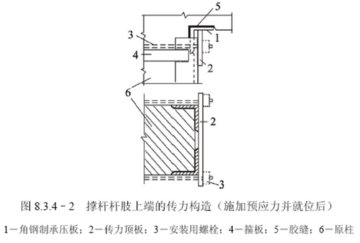 4、横向张拉完毕,对双侧加固,应用缀板焊连两个组合杆肢(图8.3.43);对单侧加固,应用连接板将压杆肢焊连在被加固柱另一侧的短角钢上,以固定组合杆肢的位置(图8.3.44)。焊接连接板时,应防止预压应力因施焊受热而损失;可采取上下连接板轮流施焊或同一连接板分段施焊等措施以减少预应力损失。焊好连接板后,撑杆与被加固柱之间的缝隙,应用细石混凝土或砂浆填塞密实。