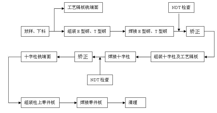 钢结构劲性十字柱加工工艺流程,内容包括放样、下料、工艺隔板铣端面、组装H型钢、T型钢、焊接H型钢、T型钢等。