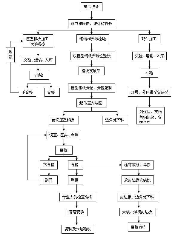 压型钢板安装工艺流程图,内容包括绘制排版图、统计构件数、压型钢板加工试验鉴定、