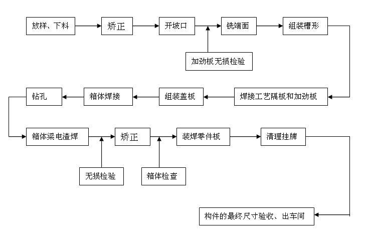 建筑工程箱形截面构件加工工艺流程,内容包括放样、下料、矫正、开坡口、铣端面等。