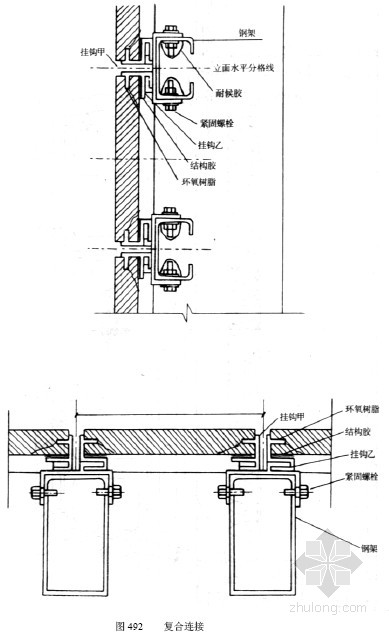 石材幕墙复合连接是采用SE勾时,在板背与SE勾接触部位再用结构胶将挂勾与板材粘接,原来的设想是在挂勾破坏后用结构胶与板材的粘接,作为第二道保险,但这种连接是多余的,因为槽勾连接破坏不可能是金属勾的破坏,而只能是石材槽口破坏,且槽口破坏时,石材剥离高度远远大于槽深,由于结构胶粘接部位处于石材剥离部位,对勾与石材的连接几乎没有任何意义(图492)。