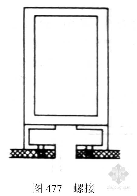 螺接(图477)。将复合板用埋头螺丝固定在副框上。这种连接没有突出复合铝板表面的螺头,连接也较牢固可靠,但在复合铝板表面有异于板面色彩的螺头,与已喷涂处理的表面不匹配。