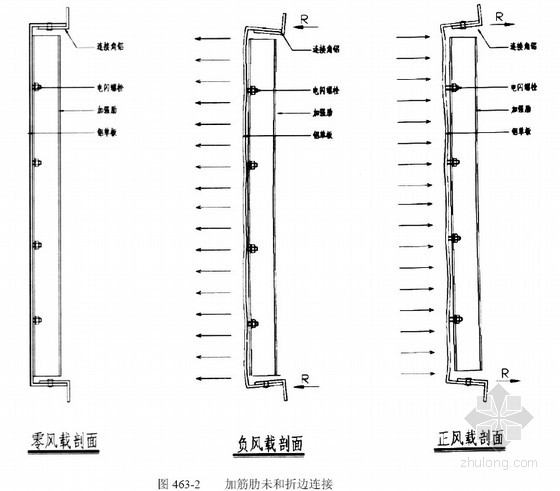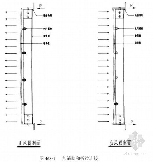 幕墙成型板可以折边,也可采用不折边平板。折边成型板折弯加工时,外园弧半径不应小于板厚的1.5倍,角开口处应用密封胶密封。可按需要设置加筋肋,肋与板的连接可采用螺接(电栓焊)、结构胶胶接或3M胶带,采用电栓焊固定螺栓时,要确保铝板外表面不变形、不褪色,保证固定牢固。加筋肋要和折边或付框要可靠连接(图463-1),因为肋作为板的支承梁,肋也要有自已的支座,将它承受的由板传来的荷载通过支座传给幕墙框架体系,如果肋未和折边(付框)边接,肋所受荷载又通过端部的连接件传给板,这一段板成为肋的支座,该区格板上的荷载传给肋后通过端部板块传给折边再传给幕墙框格体系,这一部分板在承受比设计小得多的荷载时就会由于负担太重提前破坏。(图463-2)