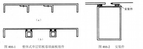 整体式单层铝板幕墙面板组件(图466-1)。整体式是将玻璃用硅酮密封胶直接固定在主框上。此时在单层铝板上加上一个如图466-2所示的安装件,安装件用铆钉与单层铝板连接,用结构胶将安装件固定在主框上。