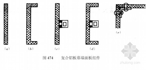 (3)平板加肋式(图474c)是为了增加复合铝板的强度与刚度的加强措施,在复合铝板中部将铝方管用结构密封胶固定在复合铝板上,方管两端用铝角码与铝质副框相连接,加强肋可以是一道也是两道或多道。