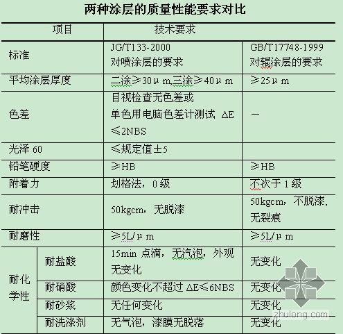 目前国内对建筑幕墙用铝型材、铝板氟碳喷涂质量与性能有明确规定,对外墙用复合铝板的氟碳辊涂层也有较明确的规定,两种涂层质量性能对比如表。