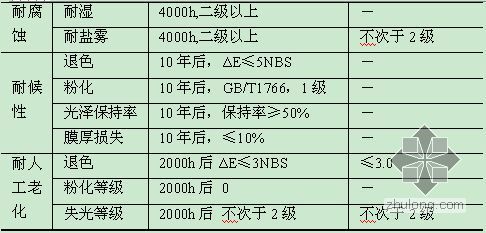 由上表可知,对于氟碳喷涂层的要求较辊涂层的要求更具体更细致一些,这可能是标准出台的时间造成的。可见两种不同加工工艺的涂层具有完全相同的性能,对于目前尚无相关标准的外墙用氟碳辊涂铝单板,其氟碳涂层的要求其主要性能指标按照氟碳喷涂的质量标准去要求也是可以接受的。