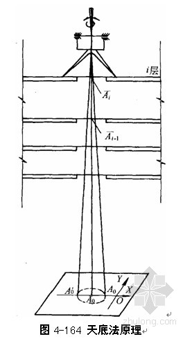 如图4-164所示,利用DJ6-C6光学垂准经纬仪上的望远镜,旋转进行光学对中取其平均值而定出瞬时垂准线。也就是使仪器能将一个点向另一个高度面上作垂直投影,再利用地面上的测微分划板测量垂准线和测点之间的偏移量,从而完成垂准测量。基准点的对中是利用仪器的望远镜和目镜组,先把望远镜指向夭底方向,然后调焦到所观测目标清晰、无视差,使望远镜十字丝与基准点十字分划线相互平行,读出基准点的坐标读数A1,转动仪器照准架180,再读一次基准点坐标读数A2,由于仪器本身存在系统误差,A1与A2不重合,故中数A=(A1+A2)/2,这样仪器中心与基准点坐标A在同一铅垂线上,再将望远镜调焦至施工层楼面上,在俯视孔上放置十字坐标板(此板为仪器的必备附件),用望远镜十字丝瞄准十字坐标板,移动十字坐标板,使十字坐标板坐标轴平行于望远镜十字丝,并使A读数与望远镜十字丝中央重合,然后转动仪器,使望远镜与坐标板原点O重合,这样完成一次铅垂点的投测。一系列的垂准点标定后,作为测站,可作测角放样以及测设建筑物各层的轴线或垂直度控制和倾斜观测等测量工作。上海金陵东路售票大楼即应用天底垂准测量方法来完成轴线的投测工作。