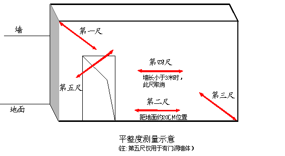 (3)当所选墙长度大于3米时,除按45度角斜放靠尺测量两次表面平整度外,还需在墙长度中间水平放靠尺测量1次表面平整度。跨洞口部位必测。这3个实测值分别作为判断该指标合格率的3个计算点。