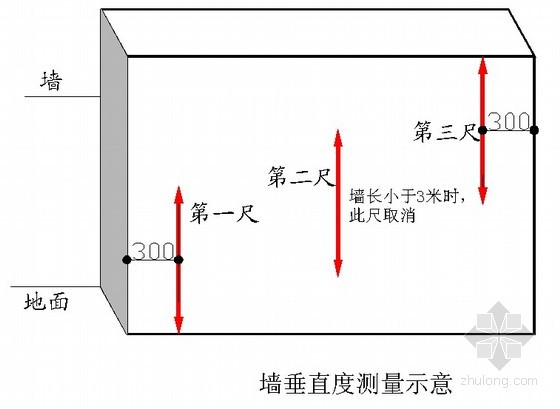 当墙长度大于3米时,同一面墙距两端头竖向阴阳角约30cm和墙体中间位置,分别按以下原则实测3次:一是靠尺顶端接触到上部砼顶板位置时测1次垂直度,二是靠尺底端接触到下部地面位置时测1次垂直度,三是在墙长度中间位置靠尺基本在高度方向居中时测1次垂直度;