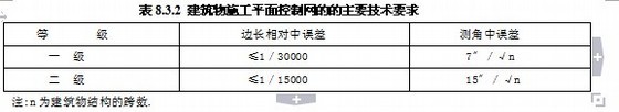 建筑物施工平面控制网,应根据建筑物的分布﹑结构﹑高度﹑基础埋深和机械设备传动的连接方式﹑生产工艺的连续程度,分别布设一级或二级控制网.其主要技术要求,应符合表8.3.2的规定.
