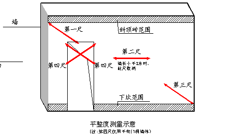 (2)当墙面长度小于3米,各墙面顶部和根部4个角中,取左上及右下2个角。按45度角斜放靠尺分别测量2次,其实测值作为判断该实测指标合格率的2个计算点。