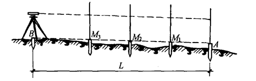 然后按前述地面上点的高程测设方法,将算出的HB值测定于B点。A、B之间的M1、M2、M3各点则可以用经纬仪或水准仪来测定。如果设计坡度比较平缓时,可以使用水准仪来设置倾斜线。方法是:将水准仪安置于B点,使一个脚螺旋在BA线上,另外两个脚螺旋之连线垂直于BA线,旋转在BA线上的那个脚螺旋,使立于A点的水准尺上的读数等于B点的仪器高,此后在M1、M2、M3各点打入木桩,使立尺于各桩上时其尺上读数皆等于仪器高,这样就在地面上测出了一条倾斜线。对于坡度较大的倾斜线,则应采用经纬仪来测设。将仪器安置于B,纵转望远镜,对准A点水准尺上等于仪器高的地方。其他步骤与水准仪的测法相同。