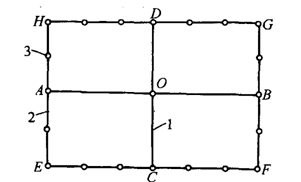 (2)矩形控制网的测设 在纵横轴线的端点A、B、C、D分别安置经纬仪,都以O为后视点,分别测设直角交会定出E、F、G、H四个角点。然后再精密丈量AH、AE、BG、各段距离。其精度要求与主轴线相同。若角度交会与测距精度良好,则所量距离的长度与交会定点的位置能相适应,否则应按照轴线法中所述方法予以调整。