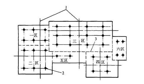 这项工序主要包括固定架设点、地脚螺栓安装抄平及模板标高测设等。其测设方法均同前。但大型设备基础地脚螺栓很多,而且大小类型和标高不一,为使安装地脚螺栓时其位置和标高都符合设计要求,必须在施测前绘制地脚螺栓图,作为施测的依据。地脚螺栓图可直接从原图上描下来。若此图只供给检查螺栓标高用,上面只需绘出主要地脚螺栓组中心线,地脚螺栓与中心线的尺寸关系可以不注明,只将同类的螺栓分区编号,并在图旁附绘地脚螺栓标高表,注明螺栓号码、数量、螺栓标高及混凝土面标高(图4-135)。