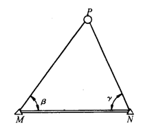 如图4-7所示,用前方交会法测定点P时,先要根据P点的坐标与控制点M、N的坐标,按式(4-18)求出控制点至测定点的坐标方位角MP、NP,然后再按式(4-20)求出夹角及。