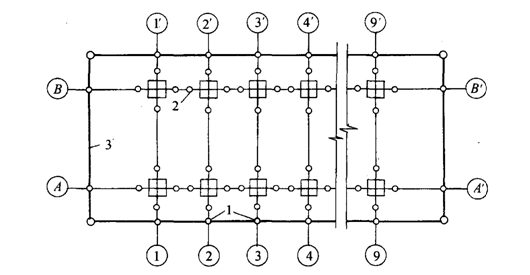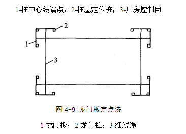 如图4-8所示,根据厂房矩形控制网上相对应的柱中心线端点,以经纬仪定向,用方向线交会法测设柱基中心或柱基定位桩。在施工过程中,各柱基中心线则可以随时将相应的定位桩拉上线绳,恢复其位置。此外,在施工放线时,定向点往往投设在龙门板上(图4-9),在龙门板上标出墙、柱的中心线,可以将龙门板上相对应的方向点拉上白线绳,用以表示墙、柱的中心线。