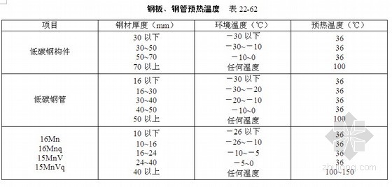 8.负温度下焊接中厚钢板、厚钢板、厚钢管的预热温度可由试验确定,当无试验数据时,可参考表22-62。