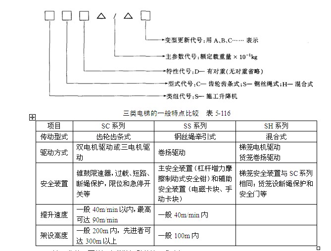 施工升降机按其传动型式分为:齿轮齿条式、钢丝绳式和混合式三种,其一般特点列于表5-116中,施工升降机的型号由类、组、型、特性、主参数和变型代号组成,见图示: