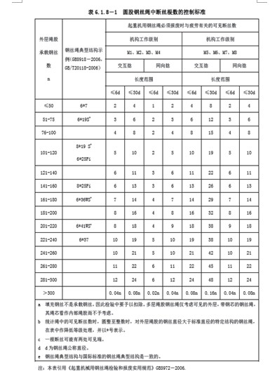 4 圆股钢丝绳断丝根数的控制标准应按表6.1.8~1 的规定执行;