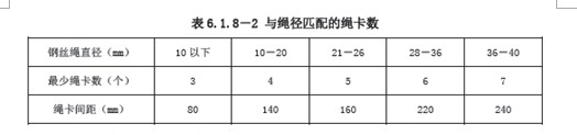 6)用绳卡固接时,固接强度应达到钢丝绳破断拉力的85%;绳卡与钢丝绳的直径应匹配,规格、数量应符合表6.1.8~2 的规定。