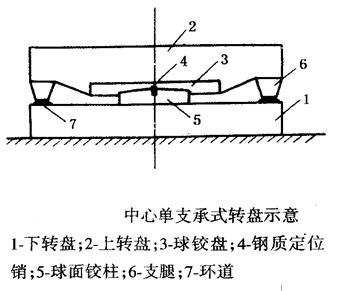 a、球面铰柱由不低于C50的混凝土浇筑于盘中央,球面用母线器成型,直径不小于100mm的定位销(钢质或钢管混凝土)固于球面铰柱中心,在球面打磨光滑,偏差符合要求后,其上覆盖塑料薄膜3~5层,浇筑球面铰柱混凝土盖,达到设计强度后,拆去薄膜,将盖、铰进行反复磨合,至单人以3m杠杆推动为止。