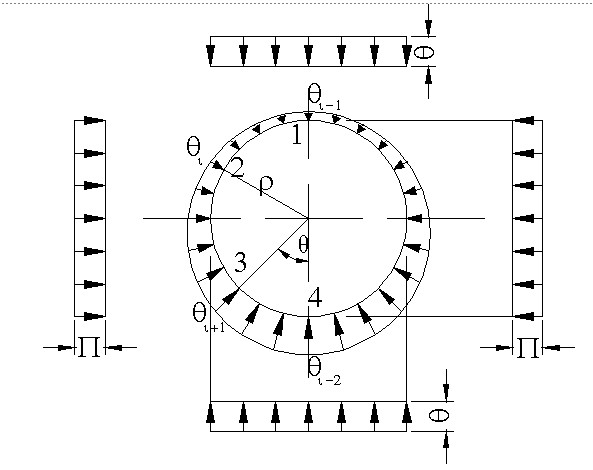 山本法计算原理在于圆环多铰衬砌环在主动土压和被动土压作用下产生变形,圆环由一不稳定结构逐渐转变成稳定结构,圆环变形过程中,铰不发生突变。计算假定: