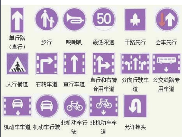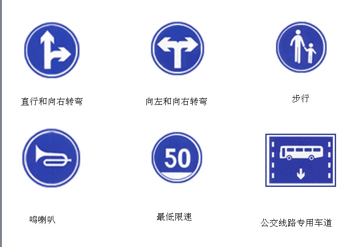 是指示车辆、行人行进的标志,其形状分为圆形、长方形和正方形,其颜色为蓝底、白色图案。