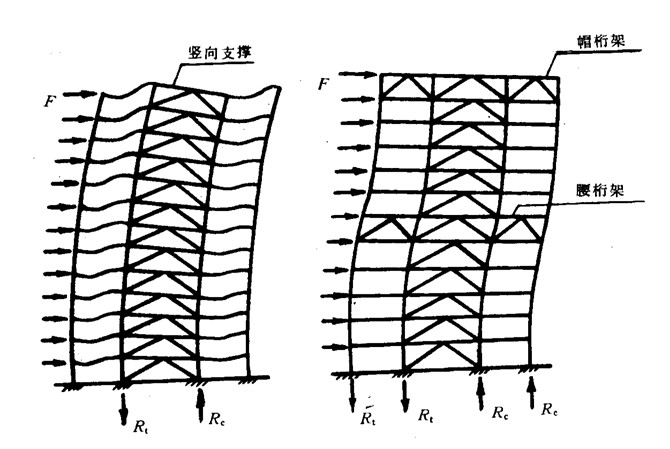 腰桁架和帽桁架是设置在内筒和外柱间的桁架或大梁,自身具备很大的刚度,可减少内筒和外柱间的竖向变形差。