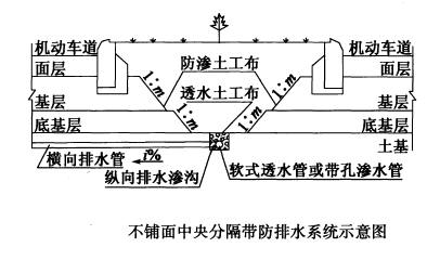 1 中央分隔带表面未采用铺面封闭时,分隔带内部宜设置由防水层、纵向排水渗