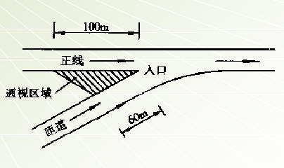一般情况下,主线出、入口应设在主线行车道的右侧。出口位置应易于识别,通常应设在跨线构造物之前,若在其后时,应与构造物保持150m以上的距离为宜。并在匝道汇入主线之前保持主线100m和匝道60m的三角形区域内通视无阻。
