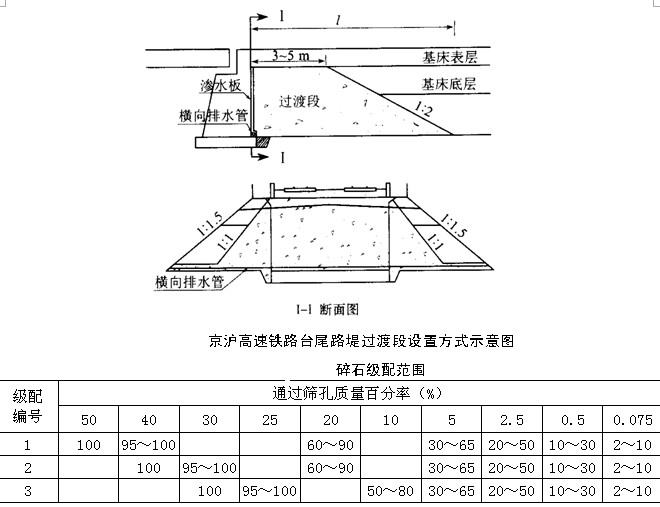 日本和德国通常采用级配碎石或级配砂砾石掺入3%左右的水泥填筑的处理方法;对于过渡段沿线路纵向的几何布置形式,日本、法国和德国多采用上窄下宽的正梯形。中国秦沈客运专线采用了倒梯形。从过渡段刚性过渡来看,都能满足要求,但相对来说采用正梯形对桥台稳定和路基施工更为有利。设计和施工时应根据桥台和路基的地基条件、高度和施工顺序采用。德国和法国高速铁路一般不主张采用加筋土过渡段结构型式。法国高速铁路的路桥过渡段形式为靠近桥台20m范围内的基床表层级配碎石中掺入3%~5%的水泥,而且在过渡段的梯形中靠桥台一侧设置一个小梯形,小梯形的级配碎石中掺入3%~5%的水泥,使过渡段的刚度曲线比较平缓。