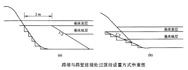 当路堤与路堑连接处为软质岩石或土质路堑时,应顺原地面纵向挖成1:2的坡面,坡面上开挖台阶,台阶高度0.6m左右,如图(b)。