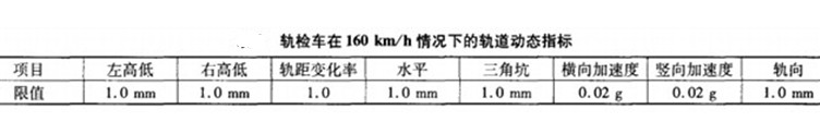 轨道动态几何尺寸的检测是通过大型轨检车进行的,利用轨检车试运营来检测轨道在负重情况下的几何状态参数,依列车运营时的平稳性和乘坐舒适度为标准来衡量。为此,在进行静态轨道调整时,也要以线路的平顺性和相对关系为重点对线路进行静态调整。轨检车在时速160km情况下的轨道动态检测指标如表所示。