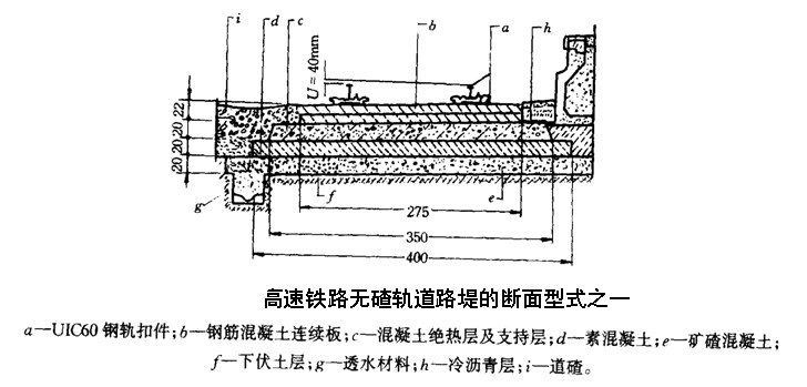 一般情况,高速铁路路基基床是由基床表层和底层组成的两层结构。有的国家针对填料、气候、无碴轨道等不同线路情况,将基床表层再细分成两层或多层,每层使用不同材料或结构。最典型的是无碴轨道的线路结构(见下图),包括钢筋混凝土板连续板、混凝土绝热层和支持层、素混凝土、矿渣混凝土、填土、道碴等。我国的京沪高速铁路路基基床由表层和底层组成,表层厚度为0.7m,底层厚度为2.3m,总厚度为3.0m。其中,基床表层由5~10cm厚的沥青混凝土和65~60cm厚的级配碎石或级配砂砾石组成。