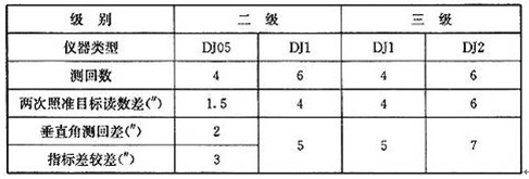 二、垂直角观测应采用觇牌为照准目标,按下表中的要求采用中丝双照准法观测。当采用中间设站观测方式分两组观测时,垂直角观测的顺序宜为:第一组:后视一前视一前视一后视(照准上目标);第二组:前视一后视一后视一前视(照准下目标)。每次照准后视或前视时,一次正倒镜完成该分组测回数的1/2。中间设站观测方式的垂直角总测回数应等于每点设站、往返观测方式的垂直角总测回数;