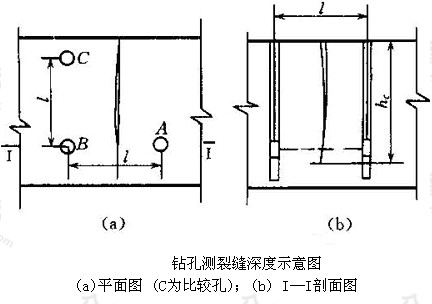 6 如图(a)所示,宜在裂缝一侧多钻一个孔距相同但较浅的孔(C),通过B、C两孔测试无裂缝混凝土的声学参数。