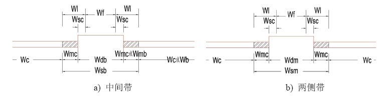1 分车带按其在横断面中的不同位置及功能,可分为中间分车带(简称中间带)及两侧分车带(简称两侧带),分车带由分隔带及两侧路缘带组成(如图)。