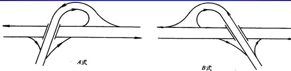 应将环圈式匝道设在交通量小的方向上,主线交通量大时应采用A式。次线上跨对转弯交通视野有利,下穿时宜斜交或弯穿。喇叭形立交可分为A式和B式。经环圈式左转匝道驶入主线(或正线)为A式,驶出时为B式。