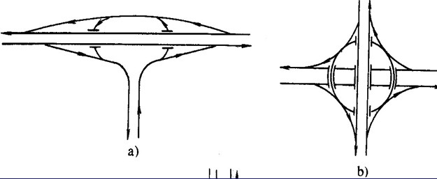 应让主线直通,中心岛可采用圆形、椭圆形或其它形状。当采用环形立交时,必须根据相交道路的性质进行比较研究,看环道的最大通行能力和所采用的中心岛尺寸是否满足远期交通量和车速的要求。适用于:主要道路与一般道路交叉,以用于五条以上道路相交为宜。