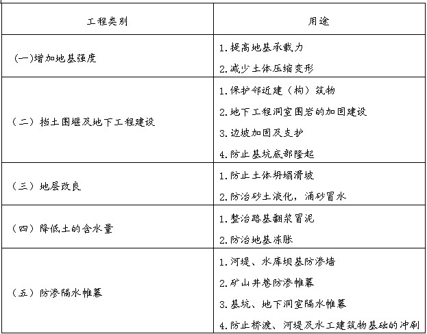 三重管旋喷法可用于永久性工程的地基加固,使用工程兴建之前,高层建筑地基加固,提高地基承载力;也可用于工程落成之后,用于制止建筑的沉降及倾斜。也可以用于临时工程,例如基坑开挖防止基坑隆起、流砂,防渗隔水帷幕,增加边坡的稳定性,防止土体滑动。按工程用途可分为如下五类工程: