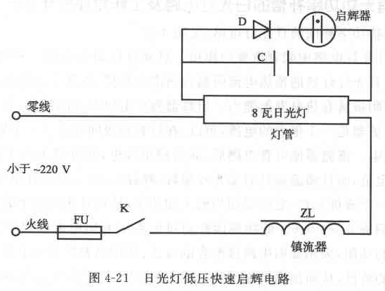 低压时的日光灯启辉困难影响灯管的使用寿命。在图中电路便用二极管