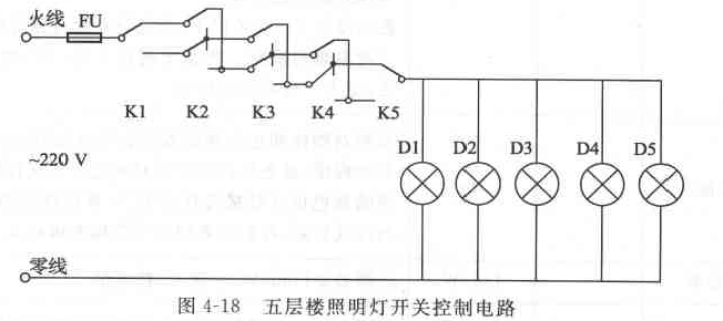 在图中5个开关分别装在一、二、三、四、五层楼的楼梯上.灯泡分别装在各楼层的通道上口这样在任何一个地方都可以控制整个楼梯通道的照明灯口例如在一层开灯.到五层楼时再关灯:或从五层楼下楼时.在五层楼开灯.到一层时再关灯。这个电路既简单实用,又能起到节约电能的作用。