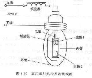 答:高压汞灯又名高压水银荧光灯。它的结构和安装接线如图4-39所示。高压汞灯有两个主电极和一个辅助电极口外玻璃管的形状是使点燃时管壁具有均匀温度而设计的。在外壳的内壁上还涂有荧光粉。制造时.抽去内外玻璃壳里的空气后再在内管中充以适量的汞蒸气和少量的氢气,有的还在内外玻璃之间充进氮气。